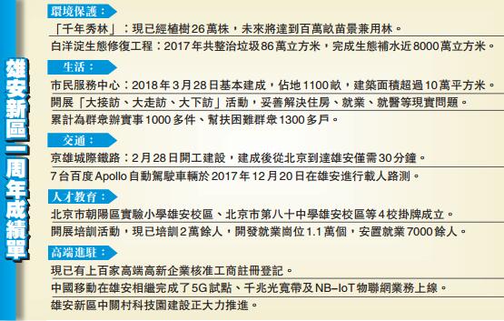新華社發表了題為《建千秋之城 辦國家大事——河北雄安新區建設發展一周年紀實》文章,用3000餘字詳細記錄了雄安新區建設過去一年內的成果(見表)。指出一年來,雄安新區堅持「世界眼光、國際標準、中國特色、高點定位」,貫徹新發展理念,努力打造創新發展示範區。這座未來之城,正邁出堅實有力的步伐。