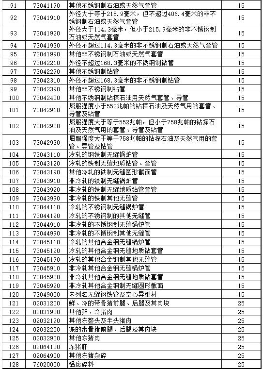 财政部认为,232措施违反了世界贸易组织相关规则,不符合“安全例外”规定,实际上构成保障措施。该措施已于3月23日起实施,对我国利益造成严重损害。为维护我国利益,平衡因美国232措施给我国利益造成的损失,我自2018年4月2日起对原产于美国的7类128项进口商品中止关税减让义务,在现行适用关税税率基础上加征关税,对水果及制品等120项进口商品加征关税税率为15%,对猪肉及制品等8项进口商品加征关税税率为25%。现行保税、减免税政策不变。