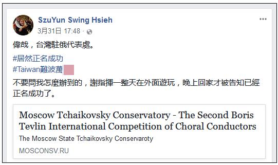 据台媒报道昨天(4月1日)报道,台北爱乐室内合唱团副指挥谢斯韵在莫斯科参加第2届杰夫林国际合唱指挥大赛,获第2名。其国籍原本被标成“中国台湾”,但经过“台湾驻俄罗斯代表处”与主办单位沟通后,却改成了“台湾”。