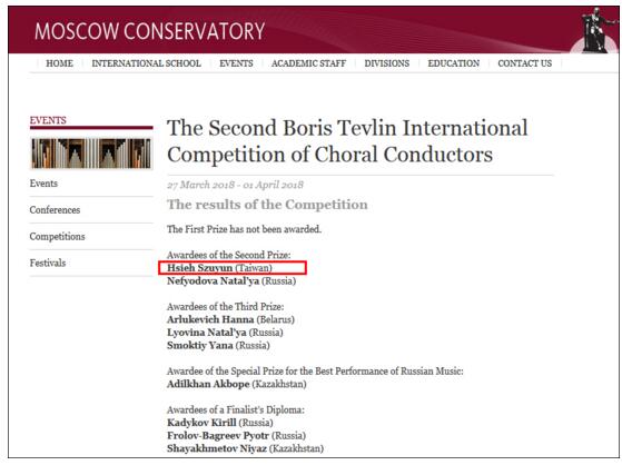 不过,莫斯科柴可夫斯基音乐学院网站在公布结果时依然将谢斯韵标注为“中国台湾”。