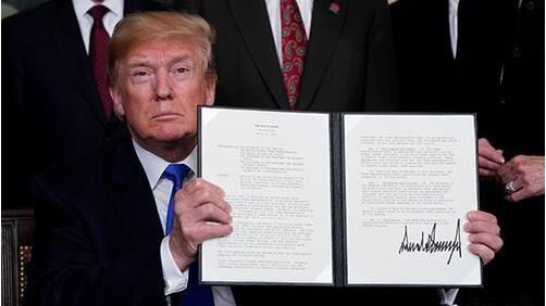 当地时间2018年3月22日,美国总统特朗普在华盛顿签署总统备忘录,依据“301调查”结果,将对从中国进口的商品大规模征收关税,并限制中国企业对美投资并购。(中新网)