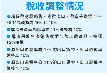 【香港商報网訊】據財政部網站消息,財政部、稅務總局昨天共同發布了《關於調整增值稅稅率的通知》(下簡稱《通知》),明確下調增值稅同時調整相應進出口退稅等。《通知》所規定調整的增值稅稅率將於今年5月1日起實施。分析指出此次減稅將利好內地高端制造業,增厚企業利潤。