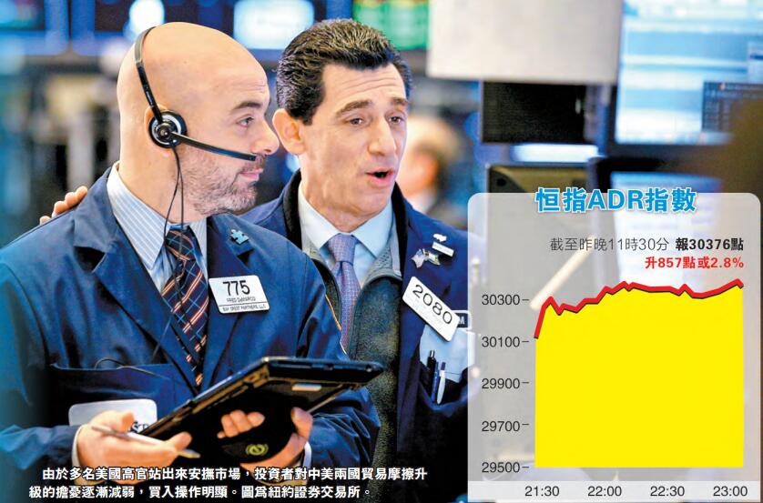 【香港商報网訊】在美國周二開列加徵關稅的清單后,中國次日即予以還擊,顯示中美貿易戰形勢開始升溫。不過,當晚美股開盤大跌后又發力上漲,最終三大股指全部錄得可觀漲幅。市場認為,之所以出現奇迹反轉,是因為美國官方對貿易爭端態度的松動,白宮首席經濟顧問以及商務部官員均放風有意與中國談判。白宮官員出口術令市場情緒得到安撫,昨晚美股造好,道指早段升逾百點;而截至昨晚11時30分,港股在美預託證券(港股ADR)指數報30376點,大升857點或2.8%。