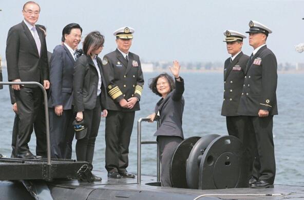 蔡英文登上停泊在码头旁“海虎”号潜艇。