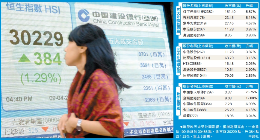 【香港商報网訊】記者吳天淇報道:憧憬博鰲論壇有利好消息公布,港股昨曾升670點,收市報30229點,升384點或1.29%,重上3萬關。國企指數收報12073點,升105點或0.88%,主板全日成交1152億元。
