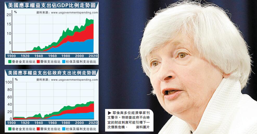 在這篇名為《債務危機正在降臨》的文章中,貝利、弗曼、克魯格、泰森和耶倫5位經濟專家表示,「在經濟強健的時期(例如當下)應維持較小的赤字,來抵銷經濟衰退時更大的赤字,恢復需求來避免更大的危機。」文章援引史丹福大學智庫胡佛研究所的研究結果稱,美國聯邦預算赤字明年將超過1萬億美元,而且「隨時間推移將更加嚴重」。文章提到,胡佛研究所視「應享權益支出」為唯一原罪。
