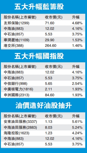 石油相關股跟隨油價造好,「三桶油」受惠全線抽升,中海油(883)升4%,報12.02元。中石油(857)升3%,報5.53元。安東油田(3337)和中海油服(2883)則升5%。分析人士表示,中東地區的地緣政治風險上升降低了投資者對於原油供給的預期,推動國際油價上漲。