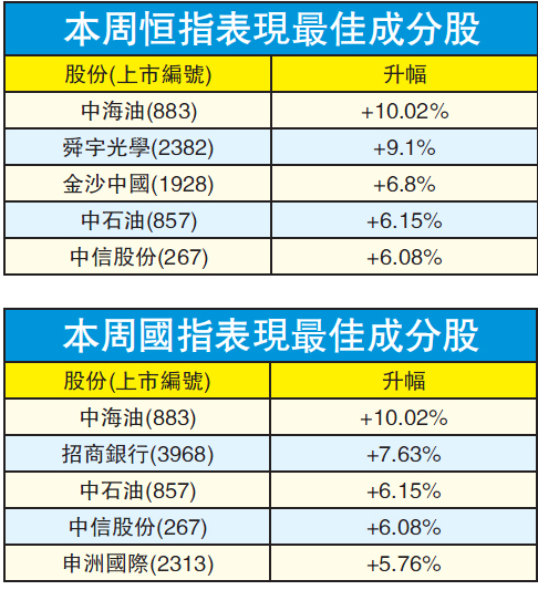 美國企業將陸續公布季績,隔夜美股收高293點報24483,惟港股上升乏力,本周兩度觸及31000點無功而返。利亞政局動蕩,油價創4年新高,帶動中海油(883)成為全周表現最好藍籌,全周上升約一成,收報12.3元。醫藥股獲利回吐,國藥控股(1099)全周跌兩成。