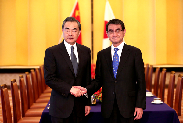 中國國務委員兼外交部部長王毅(左)和日本外相河野太郎(右)昨日在日本東京舉行會議。 路透社