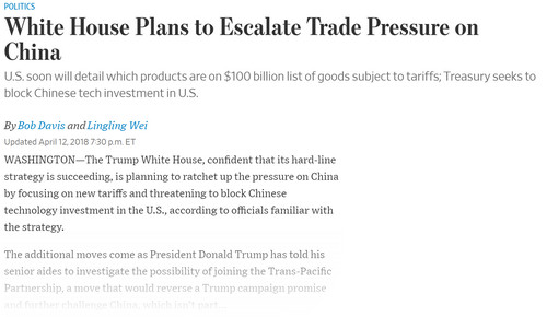 另据美国彭博社4月12日报道称,特朗普上周才扬言另对额外1000亿美元大陆进口商品加征关税,12日却表示,中国大陆和美国最终可能不会互相征收新的关税。