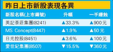 創業板昨日有4隻新股上市,除愛世紀集團(8507)外,均有賺錢。本港茶葉零售商英記茶莊集團(8241)開報1.20元,收報0.72元,較招股價0.54元,高0.18元或33.3%,不計手續費,每手5000股賺900元。本港西式及日式餐廳集團MS Concept(8447)開報0.25元,收報0.275元,較招股價0.27元,高0.005元或1.9%,不計手續費,每手10000股賺50元。