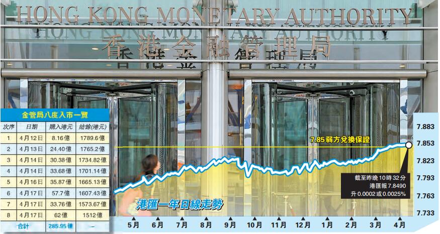 最新消息:港匯弱勢不變,繼續徘徊於7.85弱方兌換保證價,金管局在紐約交易尾段,1小時內兩度出手,先後買入15.7億和35.33億港元,合共51.02億港元。自上周四(12日)以來,金管局已先後10度入市,合共買入337億港元。