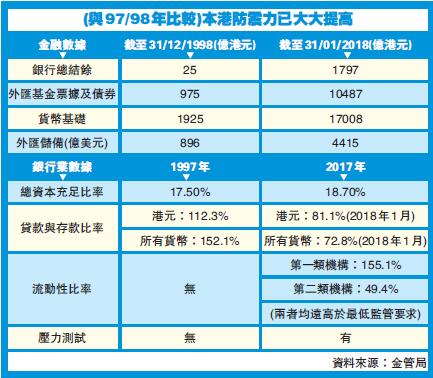 此外,據金管局資料顯示,本港的防震力已大大提高,相較於1997至1998年亞洲金融風暴期間,本港銀行總結餘只有25億元,截至今年1月31日止,總結餘達1797億元。另外,外匯基金票據及債券1997年時只有975億元,但今年年初便有10487億元,而貨幣基礎亦不可同日而語,1997年時僅有1925億元,但目前則有17008億元。(詳情參考附表)