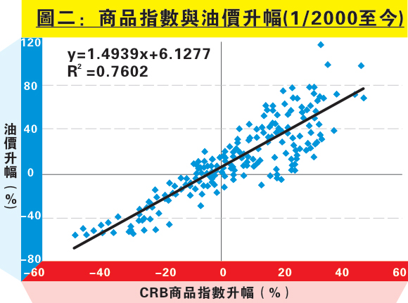 然而油價在CRB商品指數中佔比最大,目前超過三成,因此圖二可見商品指數升幅與油價升幅成緊密正比關係。若按圖一推測的結果,以最壞情況估計,商品指數變幅在四個月後將回落一成左右;再套入圖二算式,得出油價變幅在四個月後將見近一成跌幅。換言之,油價將回落至63美元左右。