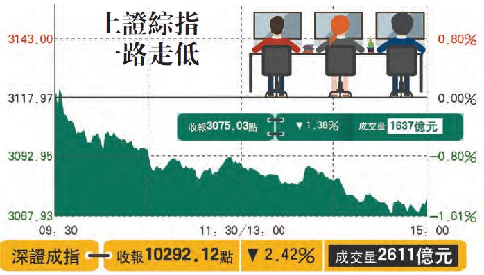當日,上證綜指以3119.50點開盤,一路震盪走低,最終收報3075.03點,較前一交易日跌42.94點,跌幅為1.38%,成交1638億元人民幣;深證成指報10292點,跌幅2.42%,成交2612億元;中小板指報6940點,跌2.44%;創業板指報1781點,跌幅2.1%。