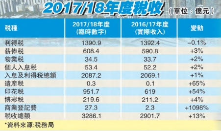 稅務局昨公布2017至2018財政年度稅務收入臨時數據,上一財年整體稅收為3286億元,與2016至2017財年比較增加384億元,增幅達13%,主要來自印花稅收入。