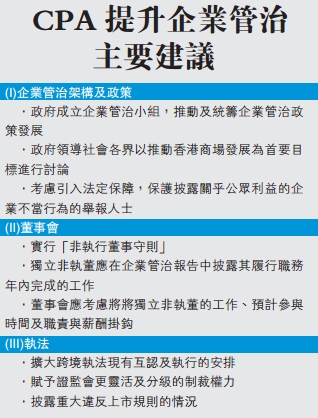 【香港商報网訊】記者潘晶報道:香港會計師公會(簡稱CPA)昨日發表《提升香港企業管治研究報告》,該報告將香港與英國、美國、中國內地及新加坡的企業管治制度進行對比,在企業管治架構及政策、董事會和執法三方面對香港的企業提出多項建議。