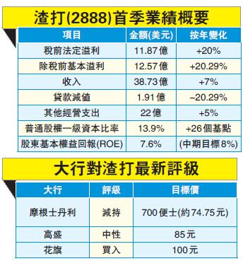 花旗則發表研究報告認為,雖然渣打收入表現未如理想,但增長動力仍正面,營運開支亦符預期,給予「買入」評級,目標價100元。另外,高盛發表研究報告指出,整體而言,渣打撥備前利潤較該行及市場預期低2%至3%。該行給予渣打「中性」評級,目標價85元。