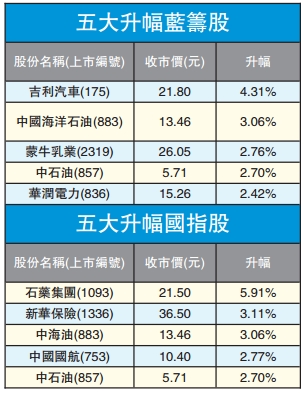 重磅股靠穩撐市,汇豐控股(005))升0.20%;中移動(941)升0.55%;友邦保險(1299)升0.51%。紐約期油升穿每桶70美元關,「三桶油」股價續升。汽車股回勇,吉利汽車(175)獲主席增持,全日飆近5%,成表現最好的藍籌股。石藥集團(1093)「染藍」,成為首隻藍籌醫藥股,最多升近一成,收市飆約6%。