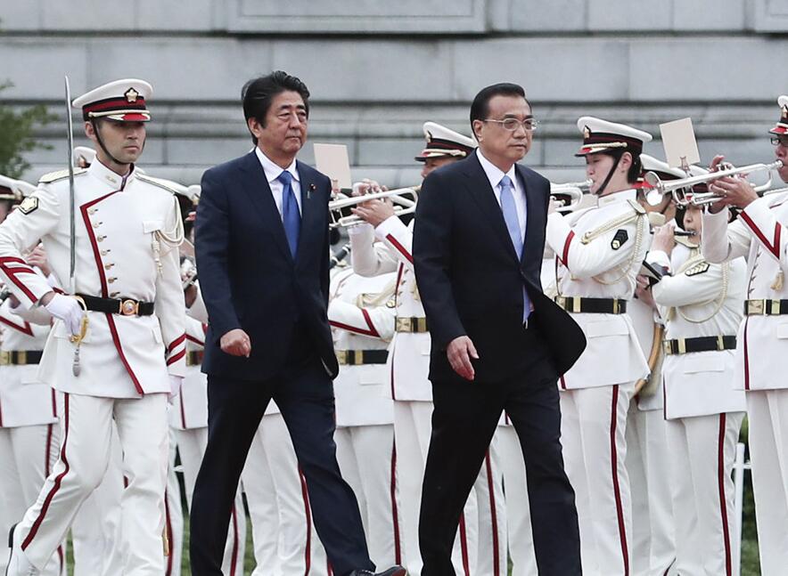 会谈前,安倍晋三在迎宾馆广场为李克强举行隆重欢迎仪式。李克强抵达时,安倍晋三前往迎接,两国领导人登上迎宾台。军乐队奏响两国国歌,中国、日本国旗迎风飘扬。李克强在安倍晋三陪同下检阅了仪仗队。