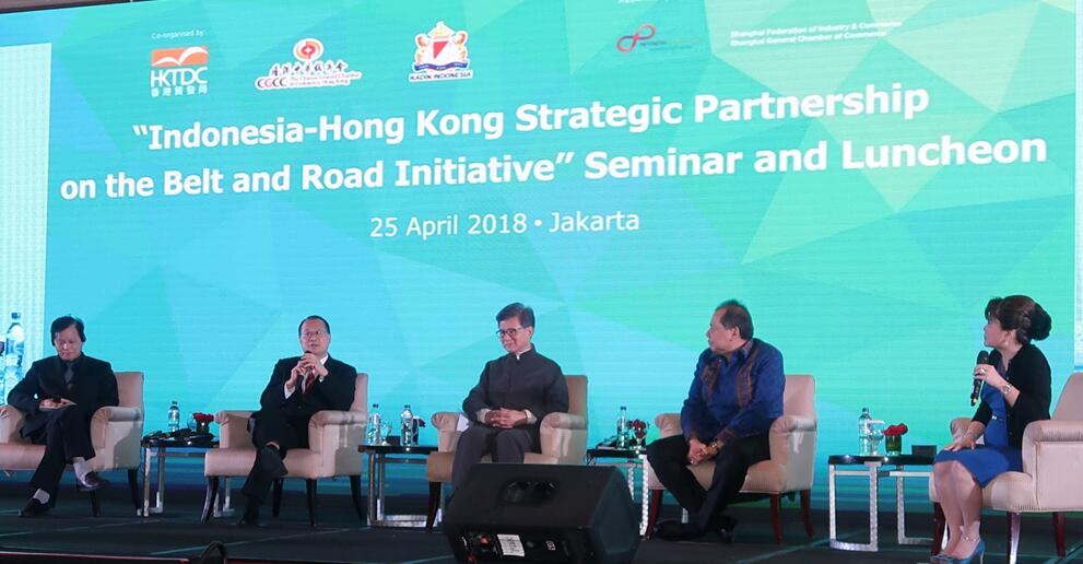 林鄭月娥在專題演講中介紹香港在推動「一帶一路」建設方面的獨特優勢,並探討香港與印尼等東盟成員國的貿易夥伴關係及未來合作機遇。她提到,去年11月香港與東盟簽訂《自由貿易協定》和相關《投資協定》,涵蓋了貨物貿易、服務貿易、投資、經濟和技術合作、爭端解決機制等各方面,將香港和東盟的合作提升至新台階。單在2017年,香港與東盟成員國的貨物貿易總額已超過1200億美元,其中香港和印尼的貿易額達54億美元,按年增長接近8%。林鄭月娥指出,香港在「一國兩制」下享有無可比擬的優勢,一方面與中國內地緊密聯繫,同時又保持了司法和體制獨立,與世界接軌。香港不僅奉行低稅率,亦是全球最大的離岸人民幣中心,在金融服務、仲裁、風險管理和項目諮詢等方面均擁有大量專業人才,可協助印尼企業開拓「一帶一路」商機。