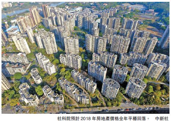 中國社科院和社會科學文獻出版社昨日聯合發布《房地產藍皮書:中國房地產發展報告No.15(2018)》稱,2018年將成內地本輪房地產市場低點,預計房地產價格全年平穩回落。藍皮書認為,今年中國樓市調控將繼續以「穩」為主,為住房制度改革和房地產長效調控機制建設營造穩定市場環境,樓市緊縮調控與去庫存政策仍將并行不悖。