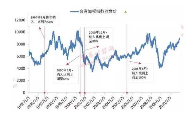 台湾:从1996年4月2日首次传出台股将纳入MSCI新兴市场指数到9月3日正式纳入,台湾股市出现一波上涨,涨幅为20.9%;1996年首次纳入和2005年全部纳入后,台湾股市均出现了一波上涨,但是在2000年纳入比例连续上调的过程中,台湾股市则连续下跌。