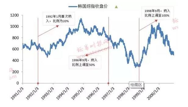 韩国:1992年,韩国综指在初始纳入时出现过短期上涨,其后便出现回调;1996年,韩国综指纳入比例上调至50%,但是韩国综指缺出现连续下跌;到了1998年,纳入比例上调至100%后,韩国综指则出现一轮较好的上涨行情。