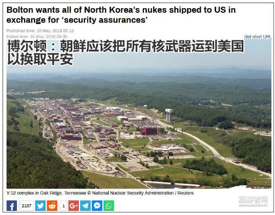 据了解,美国橡树岭国家实验室曾在几年前接收了利比亚废弃核武器和核设施的地方。分析人士认为,博尔顿此番言论无异于让朝鲜遵循“利比亚模式”。