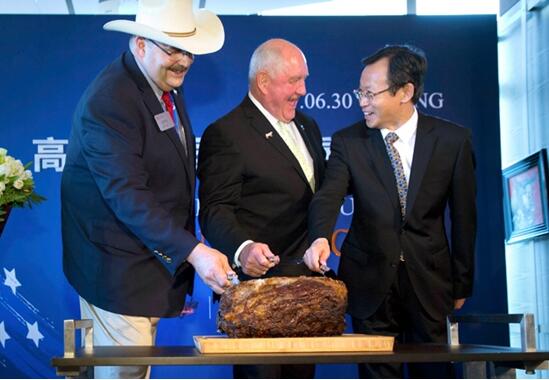 去年6月底,美国农业部长(中)与美国农场主等一起为“美牛”造势。