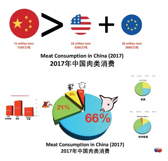 他表示,2017年中国肉类消费为7100万吨,同期美国为3200万吨、欧盟为3600万吨,即中国一年的肉类消费超过欧盟和美国的总和。不过,如果以每人每年的平均消费量来看,中国为50.3kg、美国为98.6kg、欧盟为69.6kg,在人均消费肉类产品方面中方明显仍具有较大增长空间。