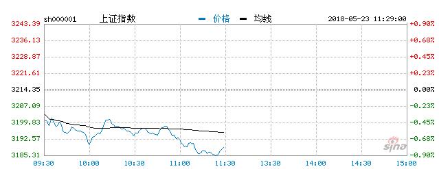 5月23日消息,沪深三大股指早盘均低开,沪指反弹无果后再度杀跌,创指跟随下挫,截止上午收盘,沪指报3188.65,跌0.80%,创指报1858.56,跌0.93%。