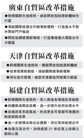 據了解,此次深化改革的方案中,廣東自貿試驗區圍繞打造開放型經濟新體制先行區、高水平對外開放門戶樞紐和粵港澳大灣區合作示範區,提出了建設公正廉潔的法治環境、建設金融業對外開放試驗示範窗口和深入推進粵港澳服務貿易自由化等18個方面的具體舉措。天津自貿試驗區圍繞構築開放型經濟新體制、增創國際競爭新優勢、建設京津冀協同發展示範區,提出了創新要素市場配置機制、推動前沿新興技術孵化和完善服務協同發展機制等16個方面的具體舉措。福建自貿試驗區圍繞進一步提升政府治理水平、深化兩岸經濟合作、加快建設21世紀海上絲綢之路核心區,提出了打造高標準國際化營商環境、推進政府服務標準化透明化和加強閩台金融合作等21個方面的具體舉措。