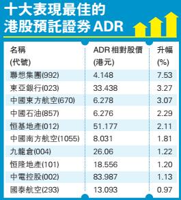上周五大型藍籌美國預託證券ADR大致向好,豐控股(005)收報77.1元,較港收市升0.05元;騰訊控股(700)收報407.08元,較港收市升3.08元。油股個別發展,中石油(857)收報6.27元,較港收市升0.22元;中海油(883)收報12.94元,較港收市跌0.18元。