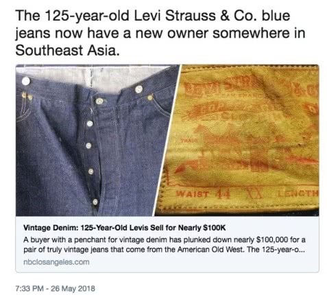 东南亚一名人士出价近10万美元收购了一条具有125年历史的李维斯牛仔裤。(图片来源:NBC Los Angeles推特截图)