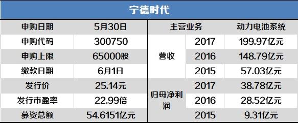5月29日凌晨,宁德时代发布IPO招股说明书,每股发行价格25.14元,将在5月30日发行(申购代码300750),发行股数约2.17亿股,预计募集资金总额54.6亿元。
