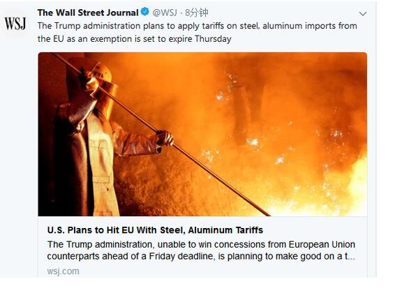 据消息人士透露,由于双方分歧巨大,欧盟不愿在周五截止日前作出让步,美国计划对欧盟钢铝制品征收关税,相关决定最早将在周四公布。今年3月1日,美国总统特朗普宣布将对钢铁和铝产品进口征收关税,欧盟方面则扬言对35亿美元美国产品对等征收。3月23日,美国向欧盟、澳大利亚、韩国、巴西、加拿大、墨西哥和阿根廷发布暂时关税豁免,欧盟的截止日期为6月1日(本周五)。周三来到巴黎出席OECD贸易论坛的美国商务部长罗斯明确表态将拒绝欧盟要求永久豁免钢铝关税的要求,但谈判的大门依然敞开。