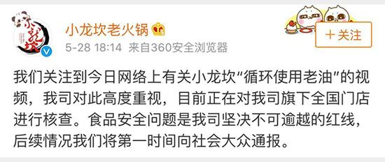 5月28日,某视频网站曝出小龙坎三家门店循环使用锅底油、回收剩菜等一系列卫生问题,一时令舆论哗然。