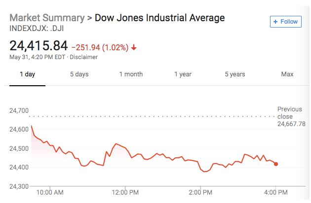 标普500指数收跌18.74点,跌幅0.69%,报2705.27点。 道琼斯工业平均指数收跌251.94点,跌幅1.02%,报24415.84点。纳斯达克综合指数收跌20.34点,跌幅0.27%,报7442.12点。