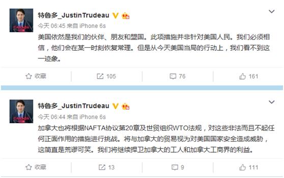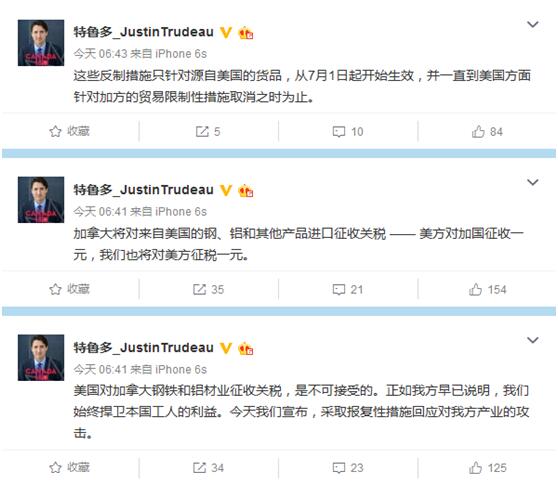 加拿大总理特鲁多连发5条微博“应战”