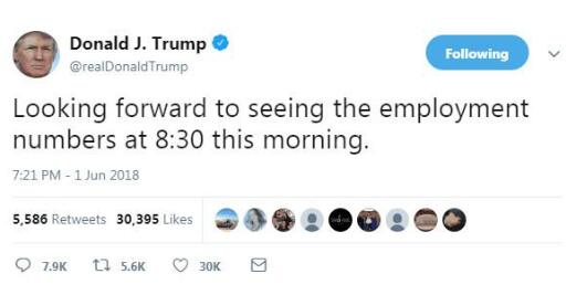 【香港商報网訊】向來喜歡在推特上發表意見的美國總統特朗普,在非農就業數據公布前打破保密慣例,發文指自己期待稍後公布的數據,被前白宮官員質疑做法是向市場發出暗示。結果顯示,5月份非農職位增長22.3萬個,高於預期的19萬個;失業率則降至3.8%的新低。
