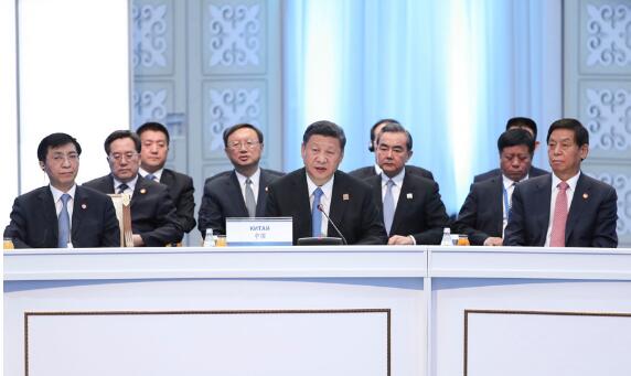 2017年6月9日,国家主席习近平在哈萨克斯坦首都阿斯塔纳出席上海合作组织成员国元首理事会第十七次会议并发表重要讲话。 新华社