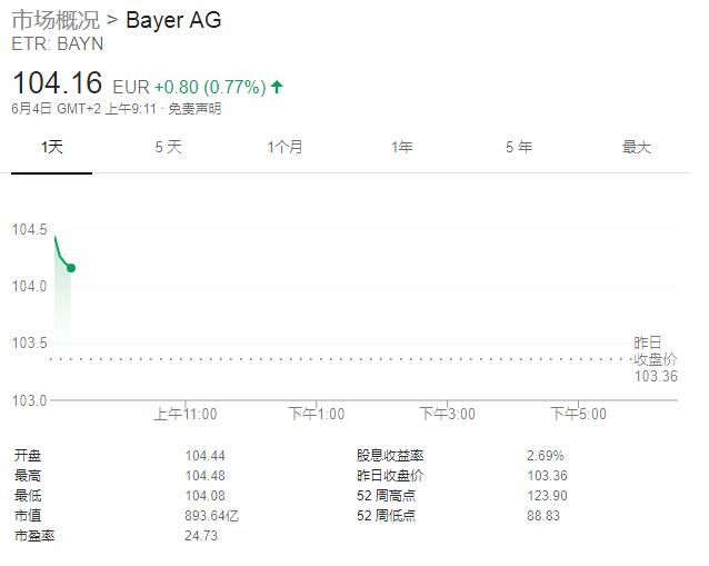 今日,拜耳股价目前上涨0.8%,市值达到近900亿欧元。