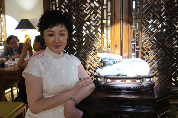 鄭優美希望與同道者多交流,一起推廣中國傳統文化。她身旁為鎮店之寶清中期白玉牛。