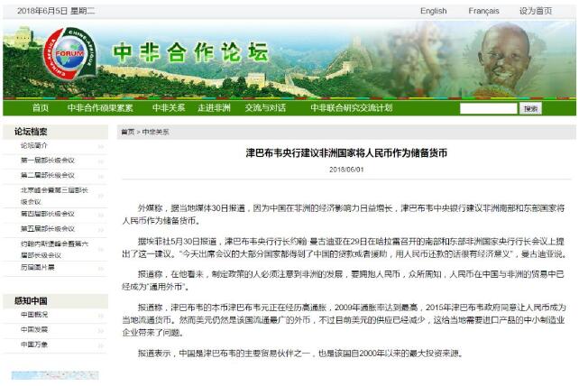 近日,中非合作论坛的官网援引外媒消息称,因为中国在非洲的经济影响力日益增长,津巴布韦央行建议非洲南部和东部国家将人民币作为储备货币。