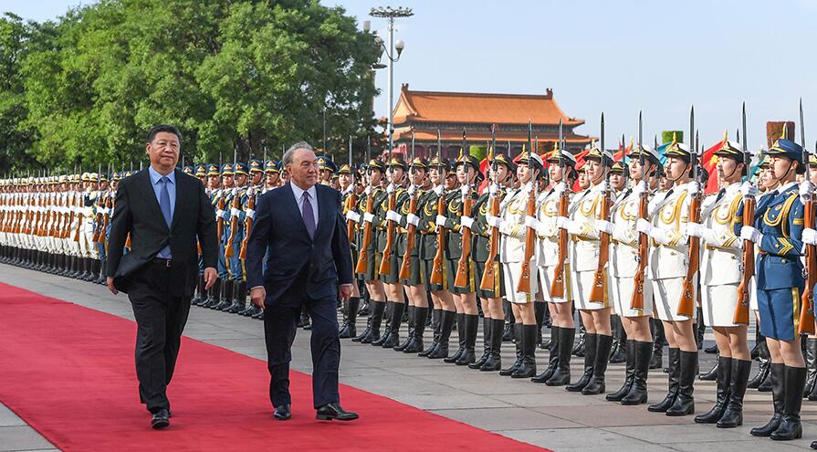 习近平在人民大会堂东门外广场为纳扎尔巴耶夫举行欢迎仪式。新华社