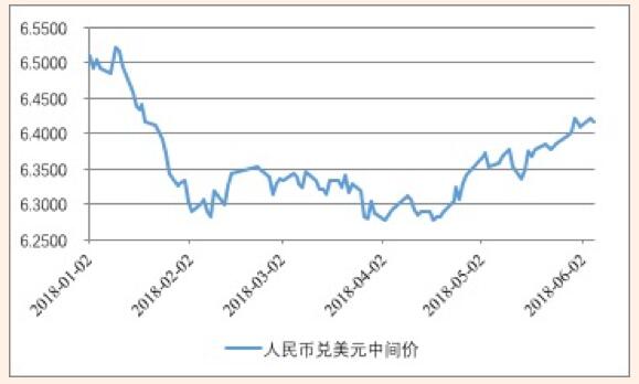 自2018年年初至今,人民币兑美元汇率呈现出一波三折之走势。如图1所示,2018年年初至2月上旬,人民币兑美元汇率由6.50左右快速升值至6.28左右,升值了大约3.4%;2018年2月中旬至4月中旬,人民币兑美元汇率围绕6.30上下持续盘整;2018年4月下旬至今,人民币兑美元汇率由6.28左右显著升值至6.42左右,贬值了大约2.2%。