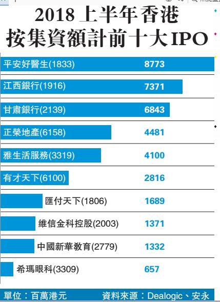 他續說:「若這3間企業成功於下半年上市,將帶動下半年集資額達2000億元,令香港重登全球集資額三甲地位。」他補充,若上述當中任何一間未能成功於下半年上市,將對全年集資額帶來很大影響,故今年的集資額較難預測。此外,中美貿易戰走向也對市場氣氛造成一定影響。