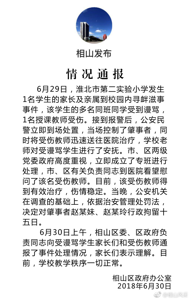 6月30日,安徽省淮北市相山区互联网宣传管理办公室官方微博@相山风采 发布情况通报称,6月29日,淮北市第二实验小学发生1名学生家长及亲属到校园内寻衅滋事事件,该学生的多名同班同学受到谩骂,1名教师受伤。