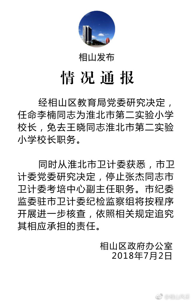 7月3日@相山风采 再次发布通告,称张某父亲为淮北市卫计委下属机构考试中心副主任,已被停职并立案调查。淮北市第二实验小学校长王晓被免职。